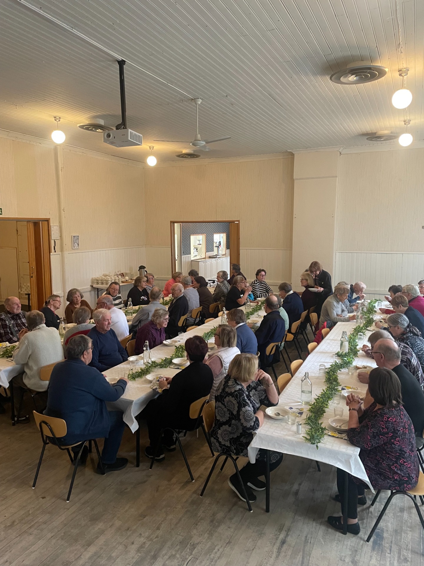 Kyläseura järjesti kylän vanhemmalle väelle yhteisen päivähetken ja tarjosi heille lohikeiton nuopparilla.