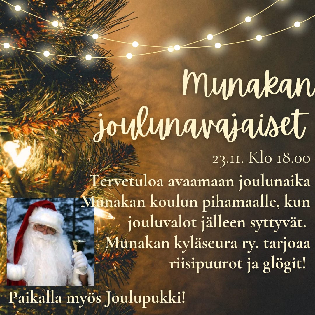 Tervetuloa aloittamaan joulunaika perinteikkäästi Munakan kylällä! Joulunavajaiset järjestetään sunnuntaina 23.11. klo 18 Munakan koulun pihamaalla, jossa kylä valaistaan jälleen upein joulunvaloin.